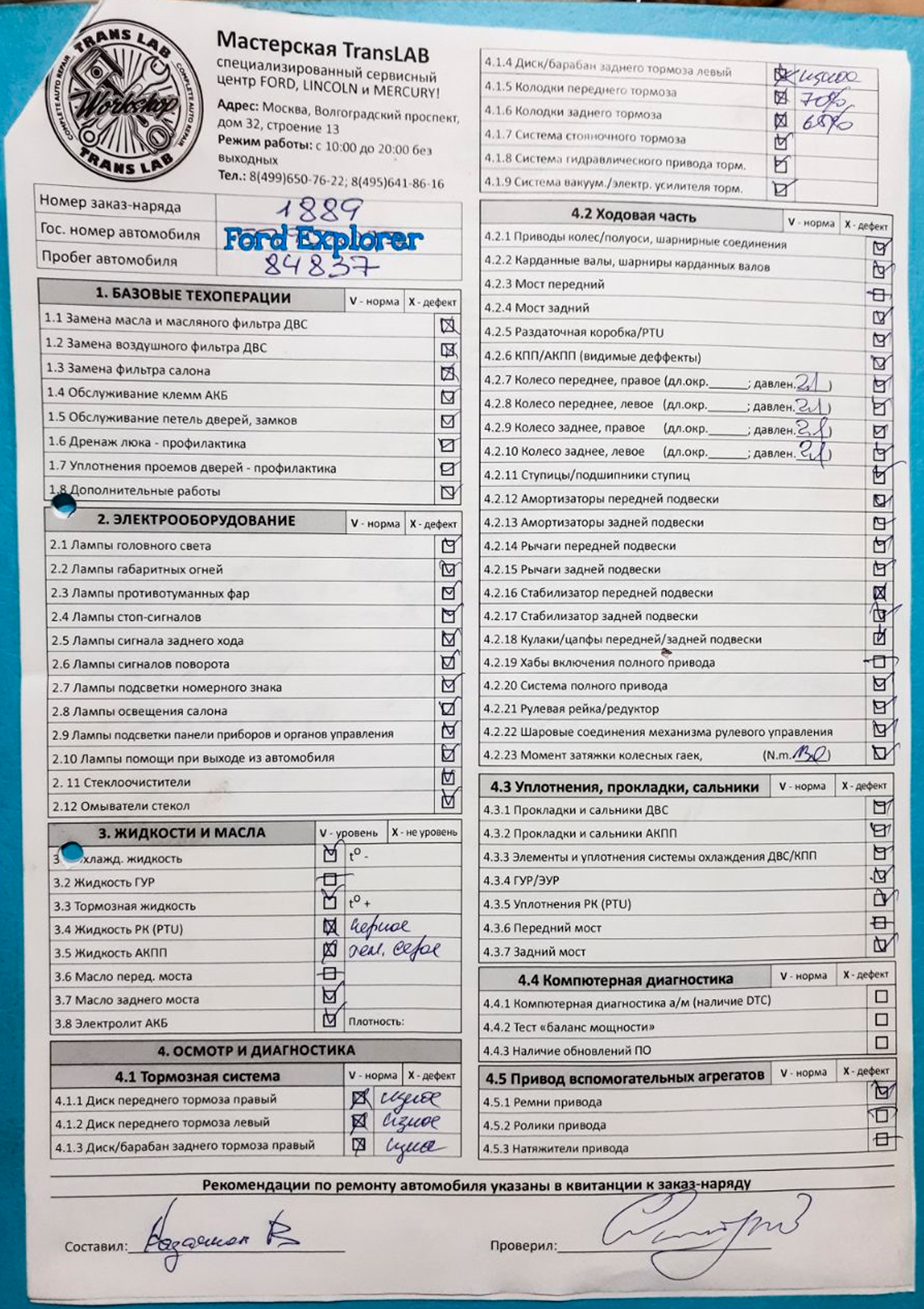 Бланк ТО Форд мастерской ТрансЛаб (чек-лист)